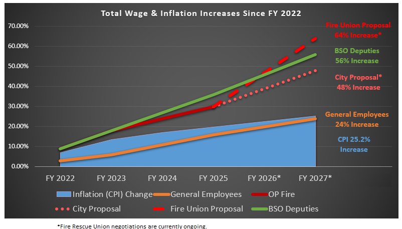 Pay and long-term benefits make up the largest share of public safety budgets. Since FY 2022, firefighters received wage increases of more than 30%, supported by step plan enhancements and additional earning opportunities. Over the same period, BSO deputies and sergeants assigned to Oakland Park received regular annual increases that combine base pay adjustments with step increases.